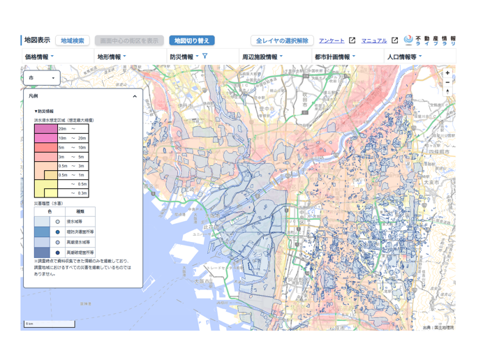 不動産情報ライブラリは、不動産取引に関する情報を重ねあわせできることが特徴である。今回追加した災害履歴についても、他の情報と重ねあわせすることで地域傾向などをみることができる。例として、災害履歴(水害)と洪水浸水想定区域(想定最大規模)を重ねあわせて地図表示する。