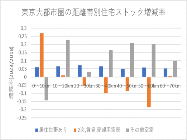 都心から0~10 ㎞圏内では2 次的住宅、賃貸、売却用の空家、10~20 ㎞圏内では放置されたその他空家の増加率が際立って高い。30km以遠の距離帯でもその他空家が大きく増加している。