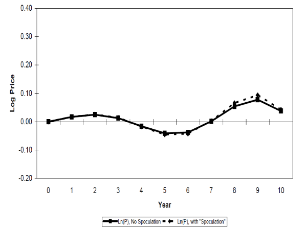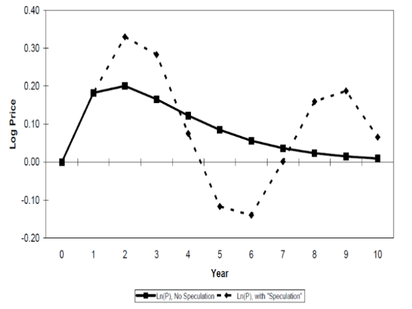 以下の図1と図2では1年目に何らかの住宅の需要増をもたらすショックがあった場合に、どのような価格変動が0~10年間で予測されるかというシミュレーション結果が描かれている。実線は合理的期待に基づく投資が行われた場合、点線は形成的期待に基づく稚拙な、いわゆる投機的取引が行われた場合である。