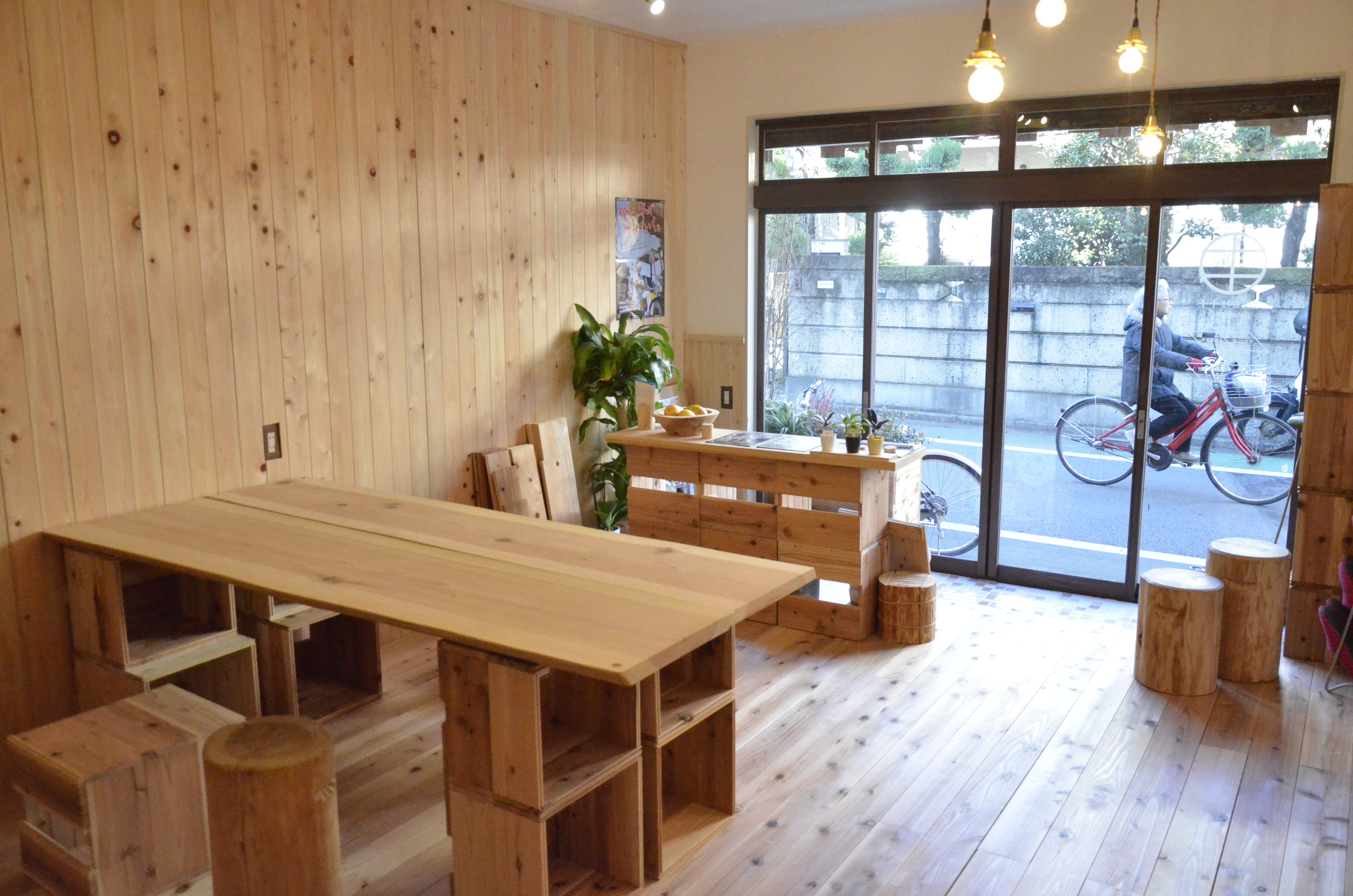 木のさわやかな香りに包まれた合同会社++のオフィス。築40年の2階建ての店舗を“SMALL WOOD”でリフォームしたという。床はスギ、壁はヒノキ。沖倉製材所のスタッフとともにDIYで仕上げた。1階は木製品のショールームも兼ねている。ⒸSMALL WOOD TOKYO安田さんは、これまでに企業の環境報告書やCSR報告書、地域の本の編集・執筆などを手がけてきた経験をもち、2012年6月に沖倉製材所の代表取締役・沖倉喜彦さん(52)とともに「SMALL WOOD TOKYO」のプロジェクトを立ち上げた。製造・販売する木製品には、スギの一枚板のテーブルや、本などの整理に使える箱型ボックスなどがあるが、中心はDIYで床のリフォームができるフローリング材。いずれも多摩産の無垢の木が使われているのだが、建材になりにくい木を使っているのが特色だ。詳しくは後述するのだが、この建材になりにくい木を、安田さんと沖倉さんは“SMALL WOOD”と名付けている。