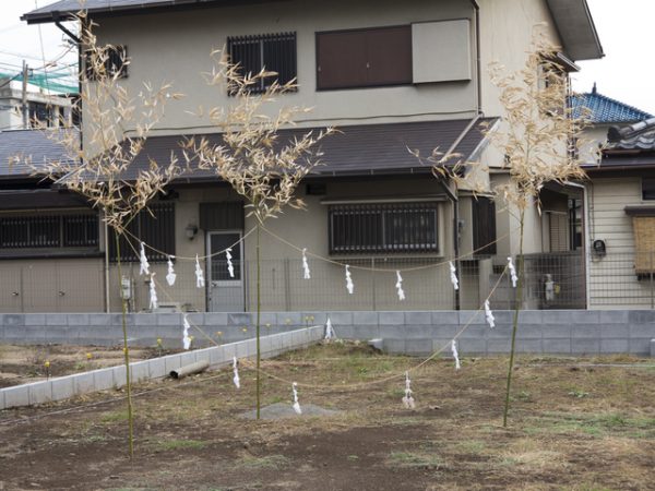 地鎮祭とは読んで字のごとく地を鎮める祭りで、土地の神様に対し「ここに家を建てさせてください」とお願いするもの。近頃では省略されることもあるが、建築の現場では昔ながらの信仰が生きていることも多く、ほとんどの新築時に斎行されているようだ。
