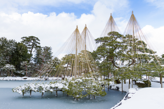 「雪吊り」は、兼六園など、雪国の庭園などで見たことがある方も多いだろう。雪国の庭園は、雪が積もって一面真っ白になっても変化が生まれるよう、背の高い樹木を配して高低差をつけるなどの工夫がされているようだ。