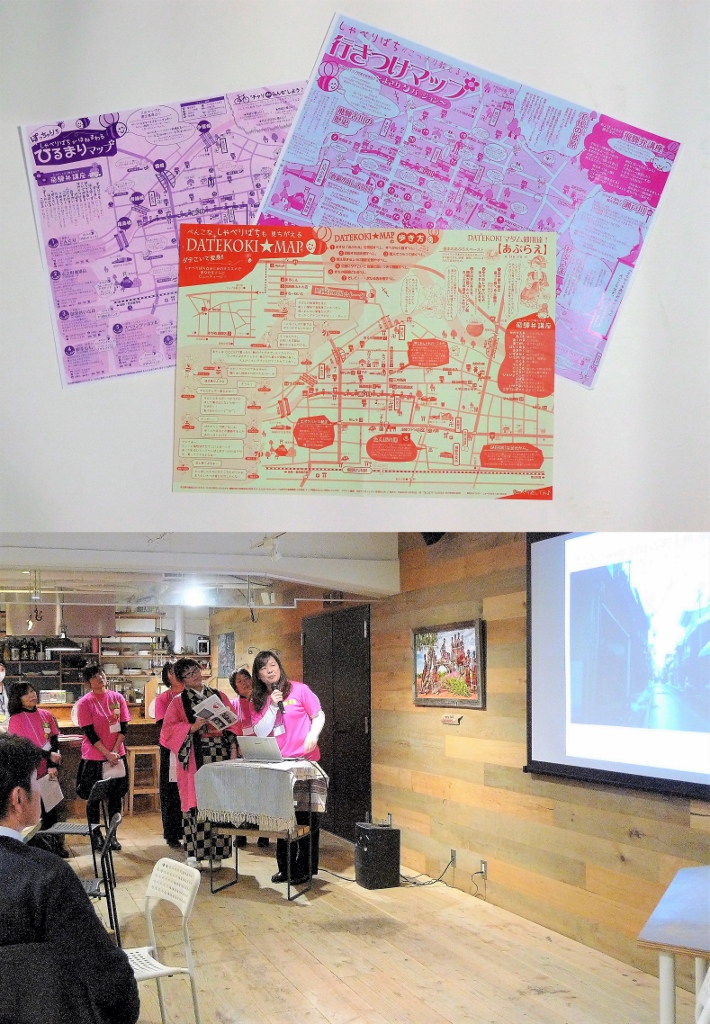 上)「しゃべりばち☆おとめの会」のメンバーが作ったまち歩きマップ。A3サイズの裏表に、メンバーが集めた古川町の楽しい情報がぎっしり下)事例発表で、古川町の魅力を語る。ちなみに着物姿のメンバーは、家業が呉服店なのだそう
