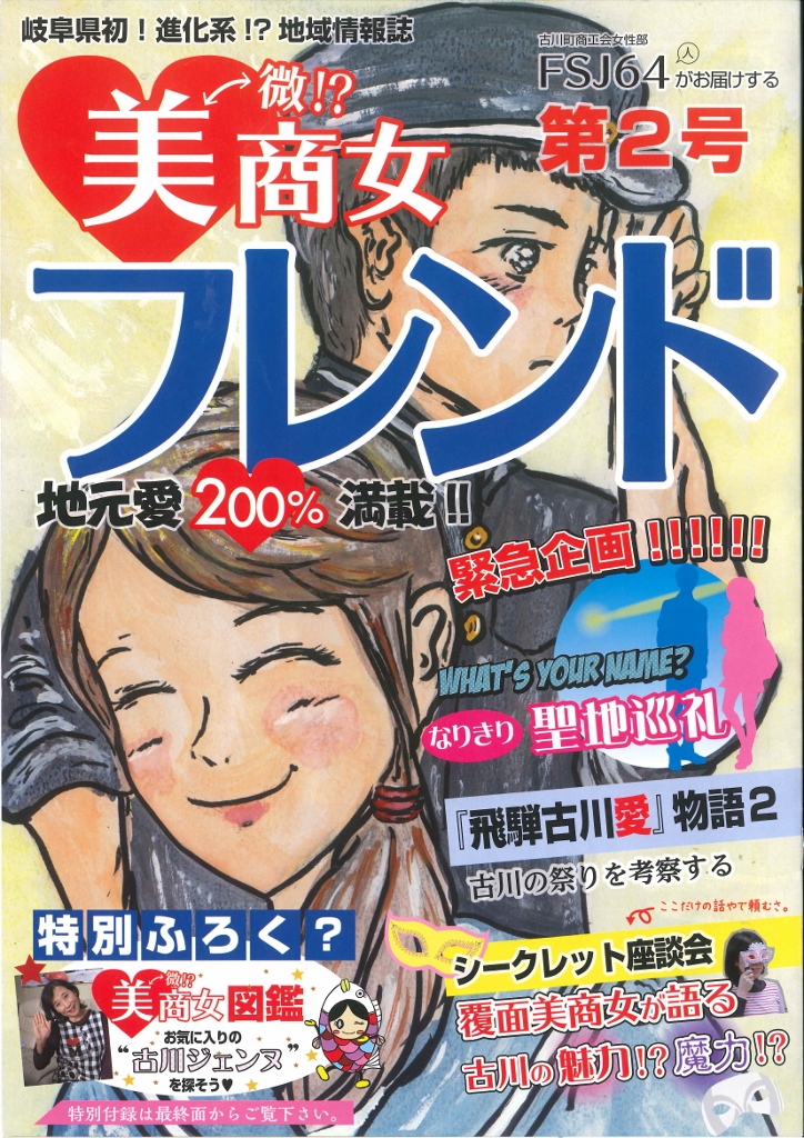 A4判で全12ページから構成され、表紙はアニメ映画「君の名は。」をイメージしたというイラストが飾る。なかを開くと、「古川美商女が行く聖地巡礼」というタイトルで、映画の登場人物になりきって古川の名所を紹介する記事や、伝統行事の飛騨古川祭など地元の祭りの特集記事、さらには古川町商工会女性部に所属する64人について、ひと言コメント付きで店を紹介する「美商女図鑑」など、地元の女性だからこそ作れるラインナップだ。