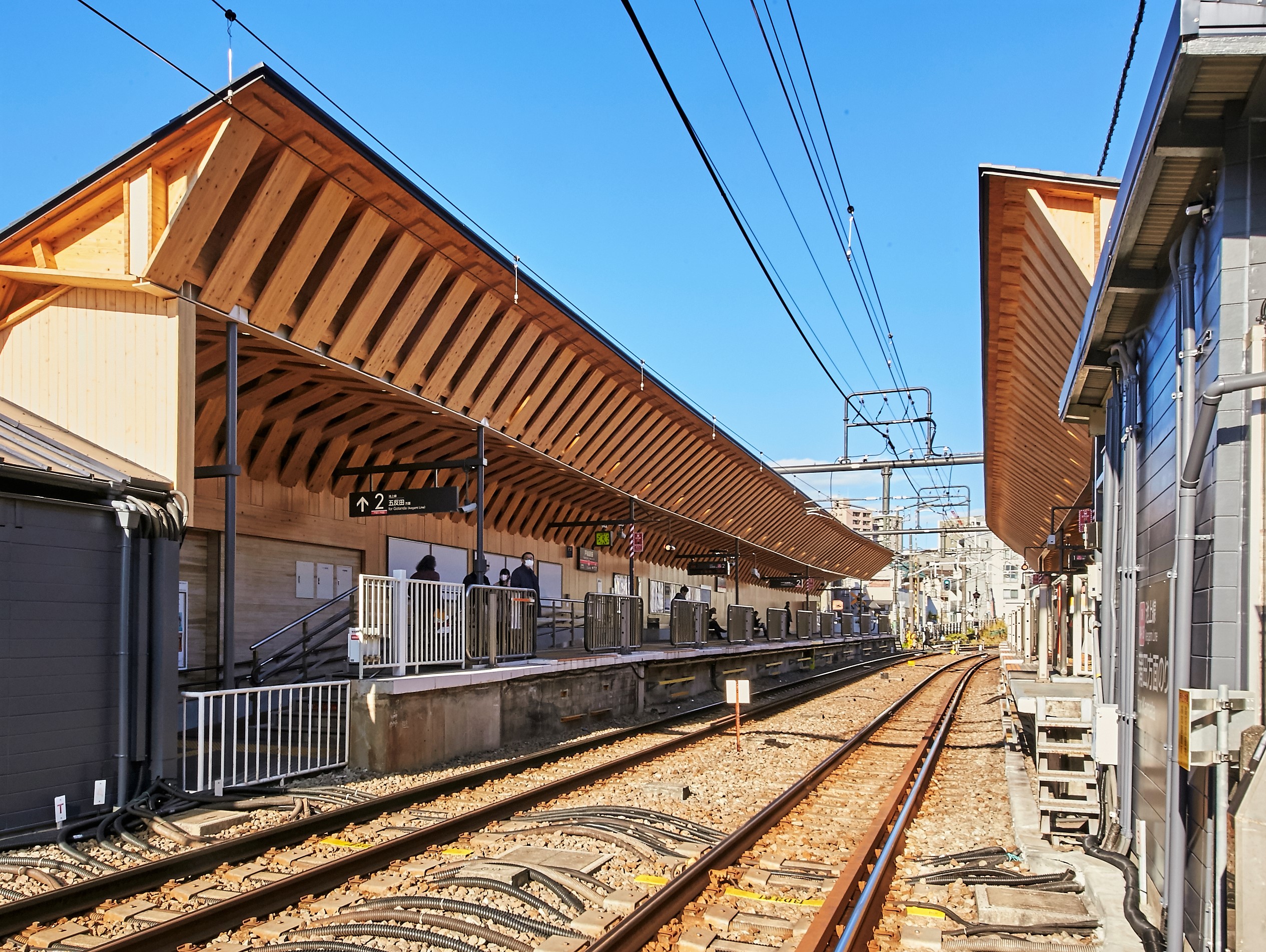 戸越銀座駅のホームに降り立つと、杉の香りがほのかに鼻腔をくすぐった。木造の屋根と壁には、多摩産の杉材を使用。アーチを支える木組みが独特の階調を奏で、広々とした空間を作り出している。