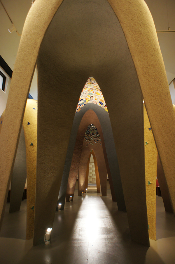 今回注目した『常滑ガウディ』は、ミュージアム内に幾つかある文化施設の一つ「土・どろんこ館」で展示されているもの。大きさも色も表情も違う縦長ドーム状の室が連なる建築物は、ガウディ建築から着想を得て、建築家、タイル、左官の職人たちが半年をかけ協働で制作を進め、試行錯誤の後ついに完成したものだという。
