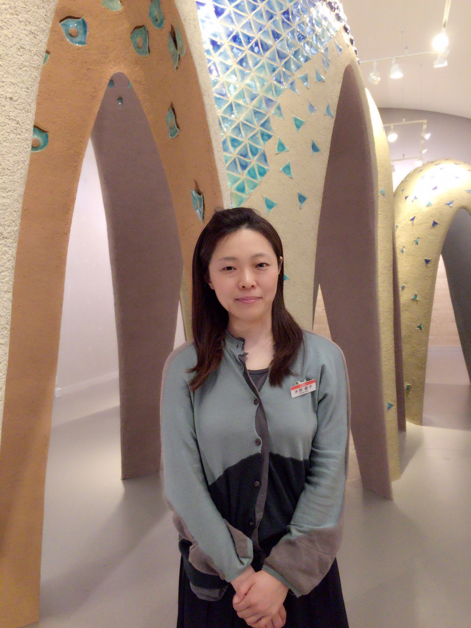 【INAXライブミュージアム】企画担当・学芸員の水野慶子さん/美しい照明演出に映える『常滑ガウディ』は同ミュージアム内の『土・どろんこ館』で展覧中。土をふんだんに使ったこの建物の中では、「光るどろだんごづくり」などいろいろな体験教室も行われている。そんな体験を通して土の魅力に触れてみるのも楽しそう! 完成図のないガウディ式のつくり方で、タイル→左官→タイル→左官…と交互に作業を行い、職人たちと相談しながら“その場で”仕上げていった『常滑ガウディ』。
