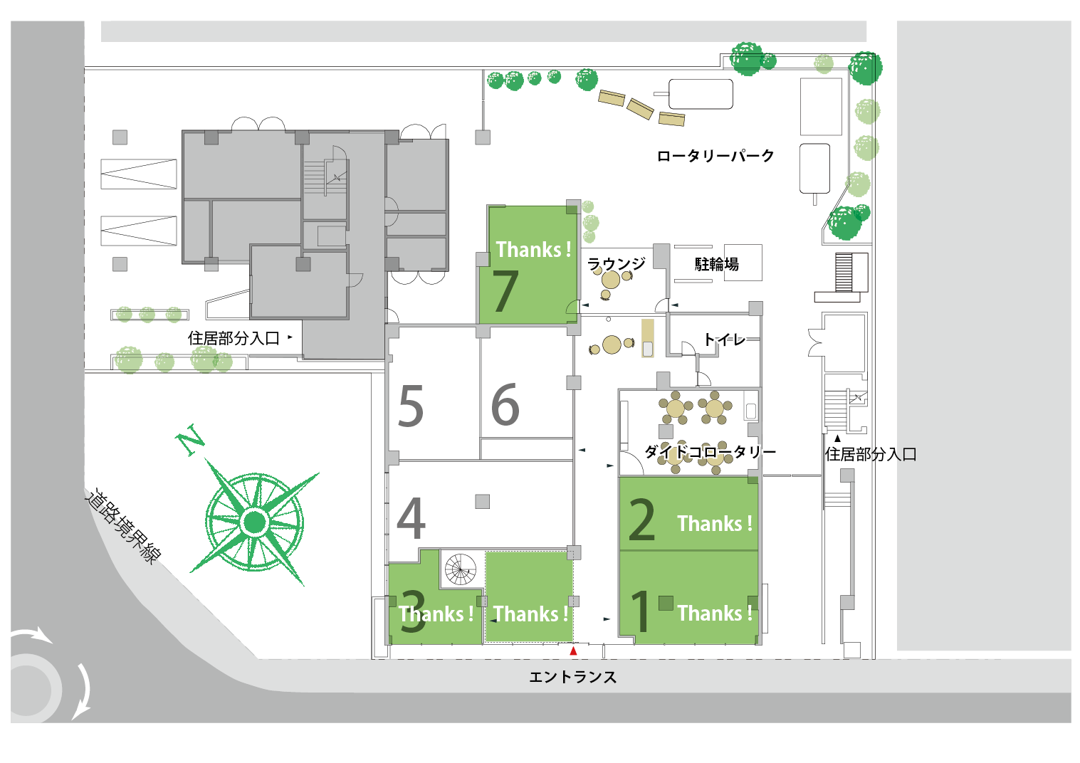 奥にある共用ラウンジと、ラウンジを抜けた「ロータリーパーク」は入居者が自由に使える余白部分。その余白を使って、定期的にSRD主催のトークイベントやマーケットが開かれる。