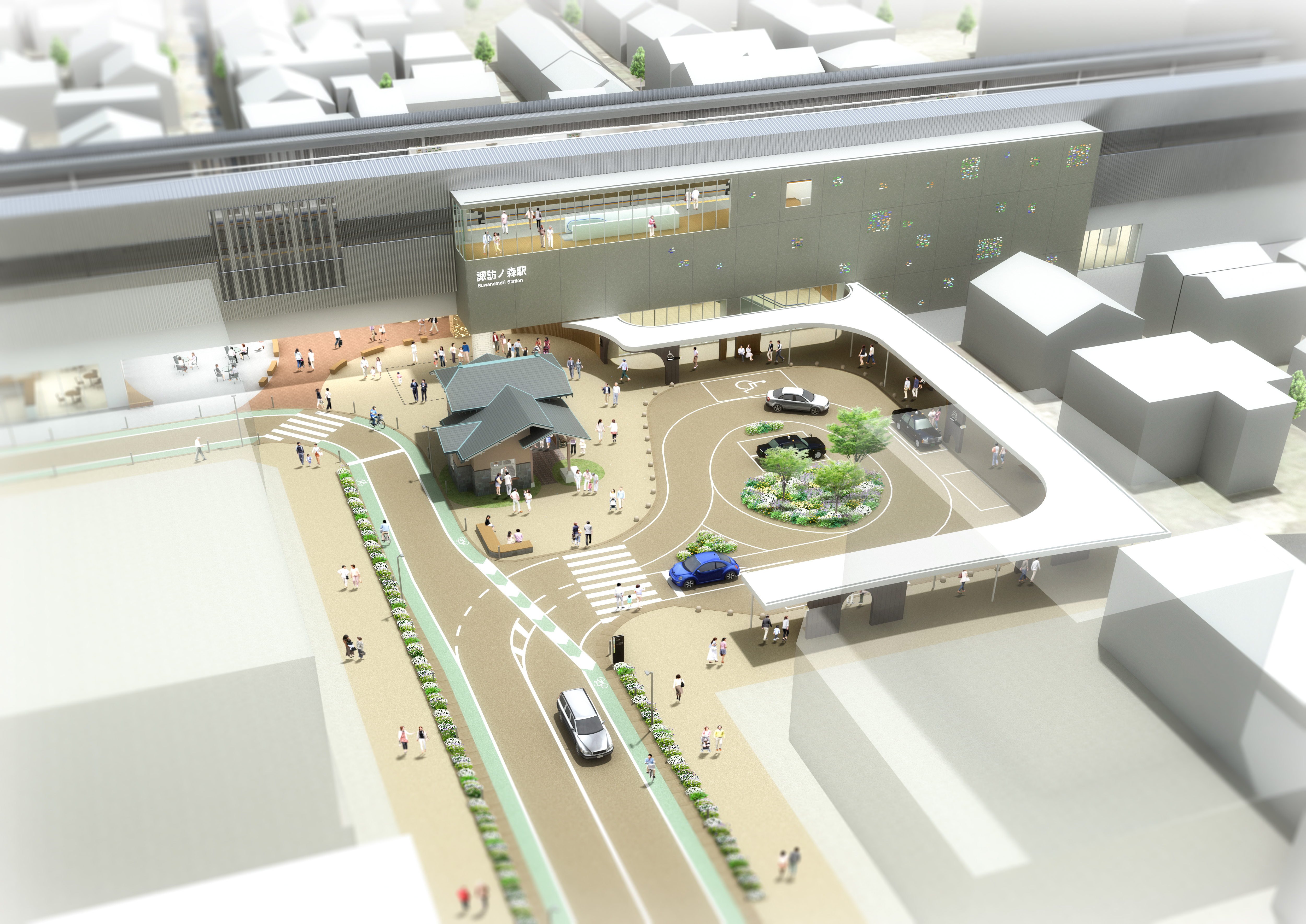 一方、諏訪ノ森駅は、浜寺公園駅と同様、次世代へ文化的価値が継承できるような保存的活用を目指すことでは一致しているが、旧駅舎は新駅舎から離し、駅前広場の東側の一角に配置する。旧駅舎にはステンドグラスがはめ込まれていたが、高架になった新駅舎の壁面には、ステンドグラスを彷彿とさせる意匠を使うなど、元々のデザインを大切にしている。