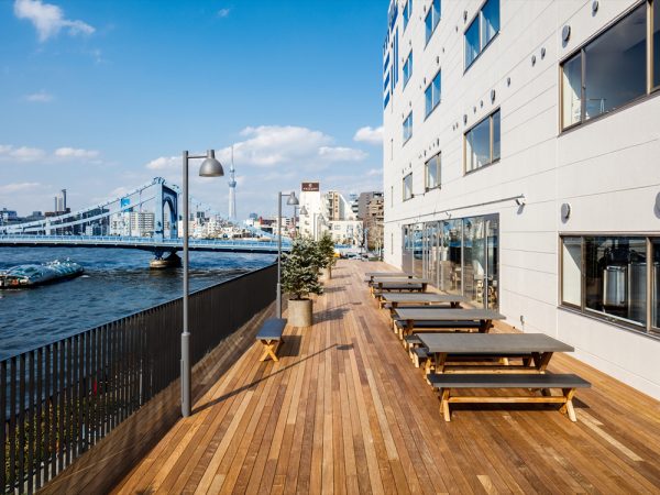 その一つが、2階部分から川沿いに向かって設置された全長44m、284m2の広さがある川床(かわゆか)だ。ここは"誰もが水辺での時間を楽しめるオープンな多目的スペース"として、宿泊者以外も利用することができる。また、この川床につながる2階には、バーベキューレストラン「PITMANS」、ビールのブルワリー「清洲橋醸造場」が併設されており、川床で食事やクラフトビールを楽しむこともできる。