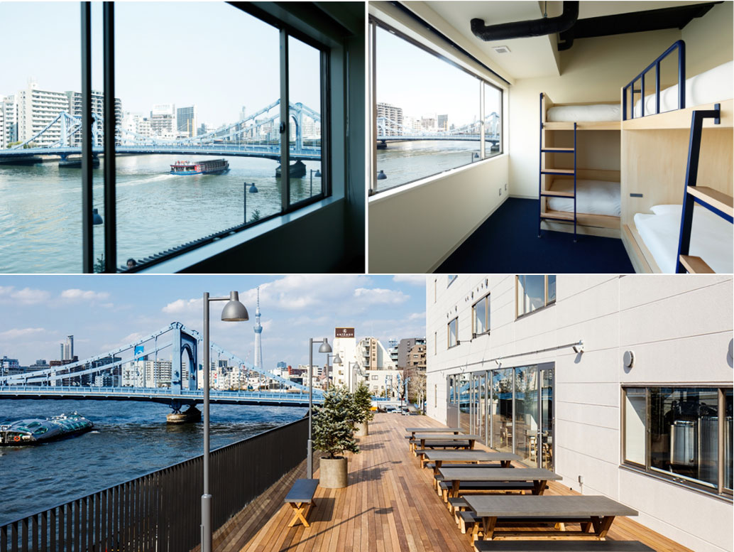 地上6階建ての施設内には、30のベッドがあるドミトリータイプと4種類の個室タイプ23室があり、収容人数は102名だ。3階以上の全客室の窓からは隅田川を臨むことができ、4階以上にある個室の客室については浴室がリバービューになっている。湯船に浸かりながら、隅田川を行き交う水上バスや東京スカイツリーを眺めるといった非日常体験を味わうこともできる。