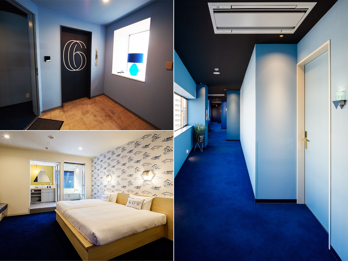 館内は隅田川をイメージした青を基調としており、ロゴのフォントや各アイコンなどの一つひとつが「川」をモチーフにした並状の3本線から構成されている。その他、個室タイプの壁に描かれている江戸小紋の柄に至っては、塗料を溶く際に隅田川の水が使用されるなど、とにかく「川」にこだわっている。この建物が建てられた1980年当時のポスト・モダンの空気を取り入れたというクリエイティブディレクションを担当した佐藤利樹氏。こうした"遊び心"によって、この場所でしか体験することができないユニークな空間に仕上がっている。
