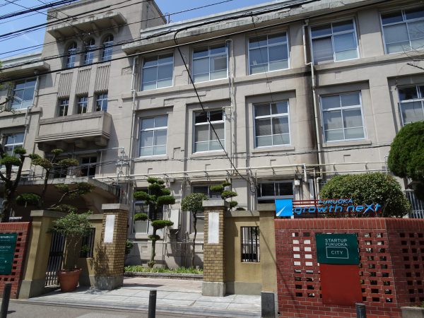 お話を伺った福岡市役所の富田さん(左)と(株)アパマンショップリーシングの泉さん。「FUKUOKA growth next」は、福岡市、福岡地所、さくらインターネット、アパマンショップホールディングスの4社が共同事業者として運営している。ちなみに全国で展開している「アパマンショップ」の1号店は、福岡市南区井尻だったそうだ明治6年に産声を上げ、日本の夜明けや戦災を潜り抜けながらも多くの児童を卒業させ、そして、みんなに惜しまれつつも平成26年3月に閉校した大名小学校。では、なぜ「スタートアップ」なのか。