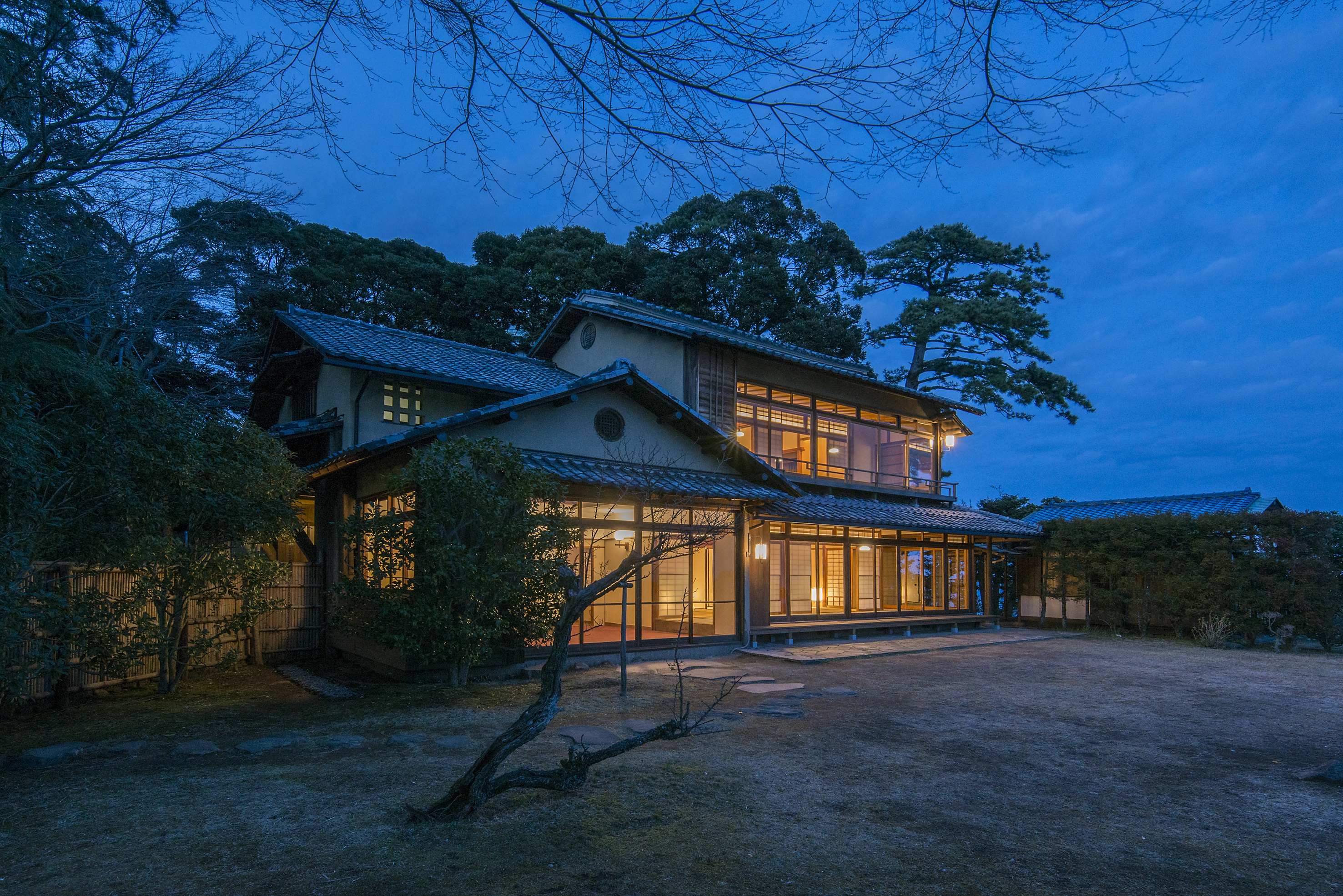 熱海の駅から坂を上り、道路からさらに少し奥まったところにその建物はある。門から石段を上がって、新緑の季節には緑が濃く影を落す静かな玄関から、建物の中、右手に入ると、洋室から和室にかけて見事に開放感のある一面の窓である。縁側や庭からは、相模湾に浮かぶ初島・伊豆大島の景色が拡がる。まさに熱海の景勝地に建てられた「別荘」からの眺めである。