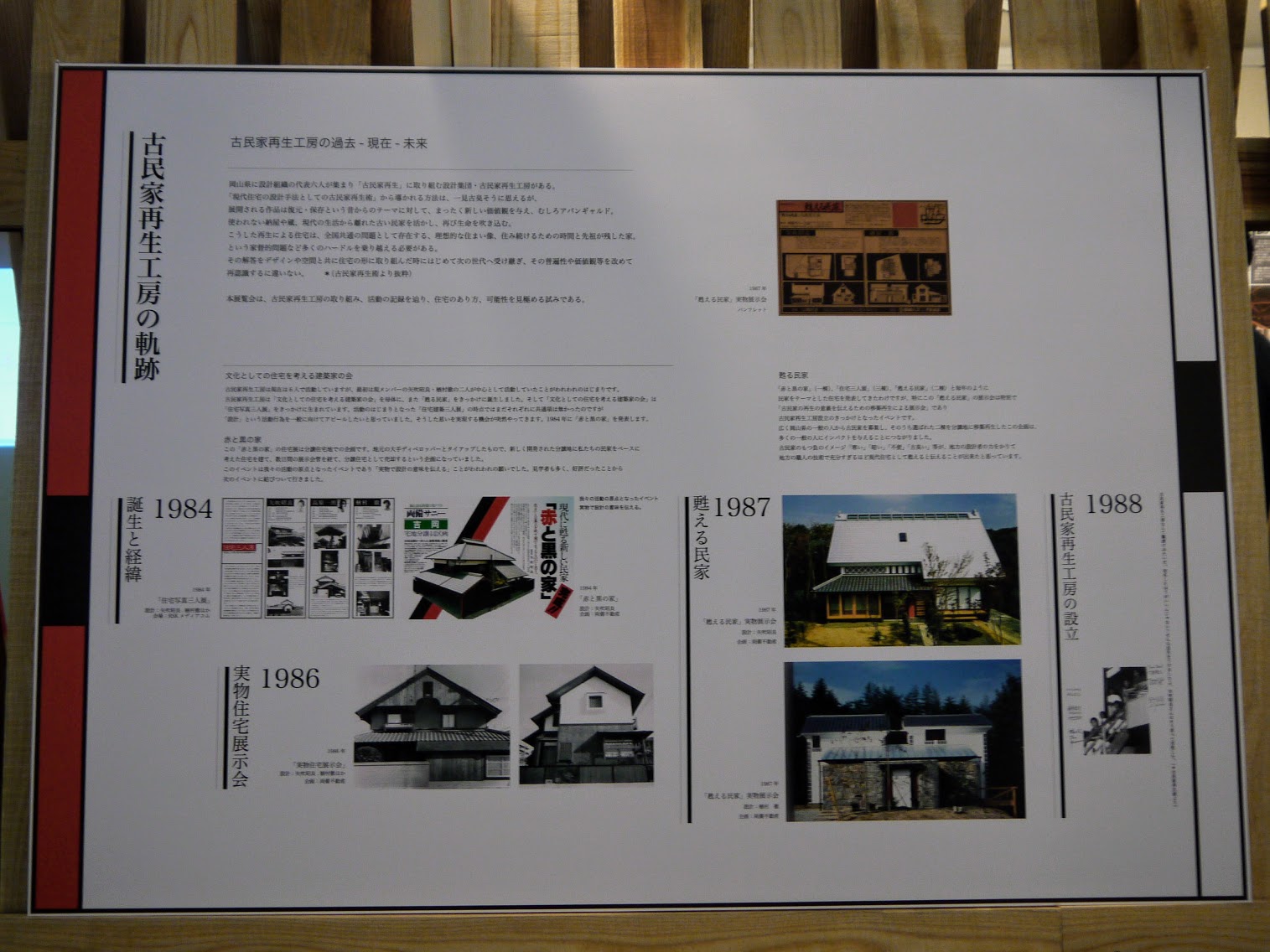 その民家研究も、当初の目的は新築住宅の設計にあった。1984年、矢吹さんは分譲住宅地のモデルハウスを依頼され、民芸調の「赤と黒の家」を設計する。“現代に甦る新しい民家”と銘打ったその家には、すぐに買い手がついた。好感触を得た住宅分譲会社は、さらに、矢吹さん、楢村さんを含む4人の建築家による「実物住宅展示会」を開催。多くの来場者を得て注目を集めた。