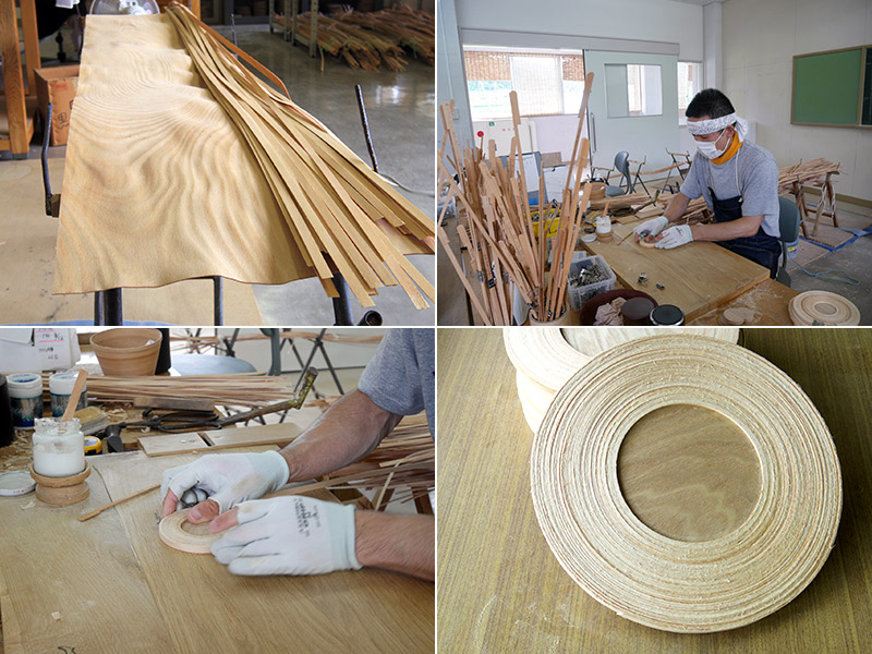まず、ブナの木を大根のかつらむきのような方法で、厚さ1mm、長さ約2mの薄い板(単板)の状態にする。それをさらにテープ状に加工する。