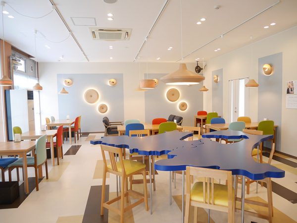 カフェは1階の元給食室をリノベーションしてつくられた。大きなブルーの青森県の形をしたテーブルが出迎える。このテーブルは、2016年に亡くなったインテリアデザイナー内田繁氏の遺作である。BUNACOの照明も使われ、インテリアにこだわったカフェが出来上がった。20人ほどが利用できる規模の大きめのカフェは、これまで西目屋村になかったそうだ。取材当日もお客さんで賑わっていて、村の人たちの交流の場所としても利用されているようだ。