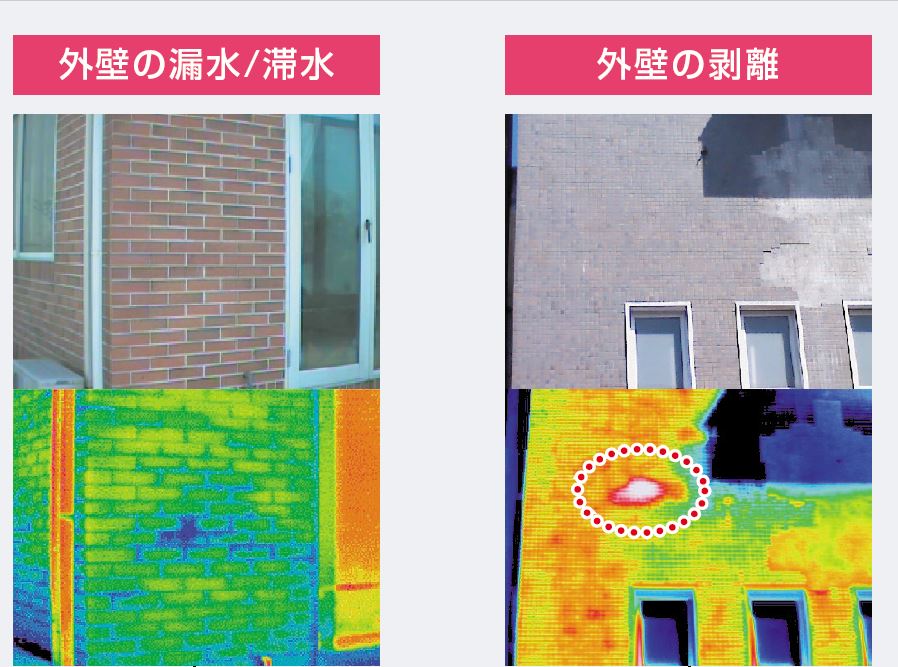 上記のような不具合は設計・施工不良のほか、経年劣化などでも生じる。これらは、いくら経験を積んだ専門家が目視しても発生場所を特定するのは至難の業だ。しかし、赤外線サーモグラフィカメラを利用すれば、暗闇の中でも建物や設備など対象物の温度差が色分けして表示されるので、比較的容易に特定できる。