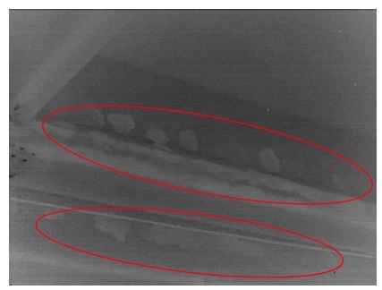 日光が当たらない場所の剥離例(鉄筋コンクリート)。通常の色分けした画像だと見分けがつかないため、あえて白黒画像としている。それでも熟練した専門家でないとどのような不具合か判断できない(資料提供:日本アビオニクス)赤外線サーモグラフィカメラの大きな特徴は、測定対象物から離れていても診断が可能であるということだ。その結果、以下のようなメリットが生まれる。