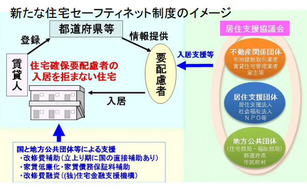 また、住宅確保要配慮者と物件のマッチングを円滑に進めるために、都道府県が家賃債務保証等の居住支援活動を行うNPO法人等を指定し、情報提供や入居相談を実施するとしている。