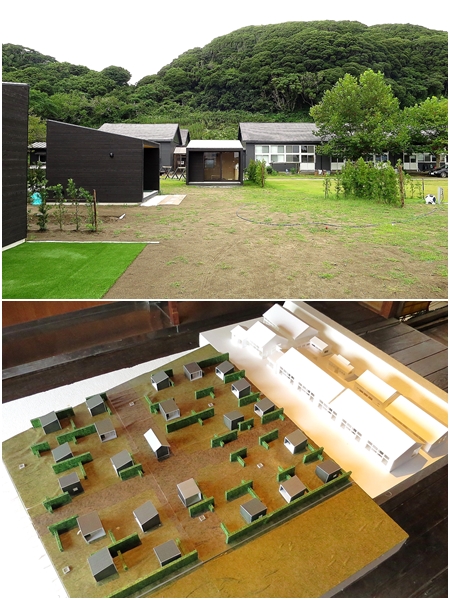 上/校庭を「小屋付き農園スペース」として活用するプランが高い評価を受け、シラハマ校舎の誕生につながった。今後校庭には全21棟の「小屋」が建つ予定。小屋のまわりには区画を分ける2.5mと1.2mの生垣を設置。小屋はそれぞれ向きを変えて配置し、プライバシーが保てるように配慮されている 下/シラハマ校舎の建築模型。中央の小屋にトイレと浴室がつくられる予定シラハマ校舎は2014年秋、南房総市による旧長尾幼稚園・小学校の利活用事業案に応募し、採用されて事業化した多目的施設。