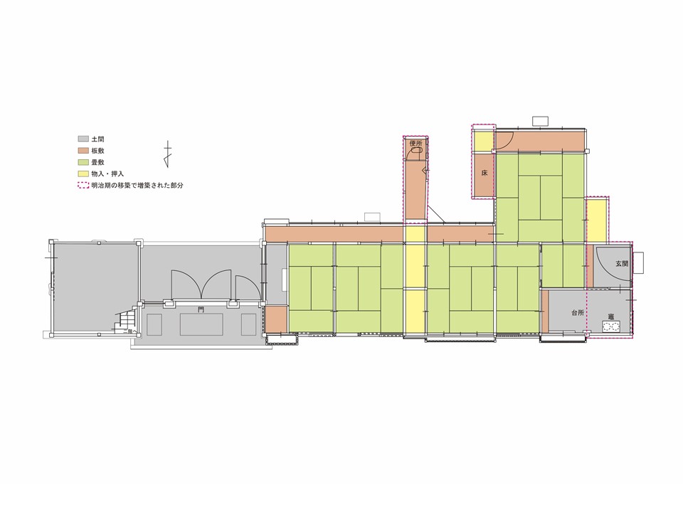 この移築時に、長屋門には改造が加えられている。西側には庇をつけて玄関や台所・土間が作られた。南側に突き出た便所も新設。南端の八畳間の床の間も移築にともなって造作されたが、なんにせよ、骨格となる長屋門の遺構がこの移築によって現代につながれることになった意義は大きい。