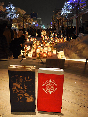 毎年2月に開催され、今では滝川の代表的なお祭りの一つと言えるくらいに成長した「たきかわランターン・フェスティバル」もA.C.T.から始まったプロジェクトだ。紙袋に絵を描いたり、切り抜いたりしてつくるアート作品が雪で真っ白に覆われたまちを彩る、一夜限りのイベントである。五十嵐氏がアメリカに住んでいた頃、友人宅へ訪れた際に手作りの紙袋ランターンで歓迎してもらったことが着想となったそうだ。2003年から始まり、先日16回目を迎えた。8回目まではA.C.Tが運営、現在は有志で結成する実行委員会が運営している。初めは数百個の紙袋で商店街の一部から始まったが、9回目からは商店街の一部が歩行者天国になり、飲食ブースが登場。今や、市内の学校や高齢者施設など110団体で紙袋ランターンがつくられ、15,000個の紙袋ランターンが滝川の商店街から国道まで伸びるお祭りへと成長した。協賛企業は200社にも及ぶ。