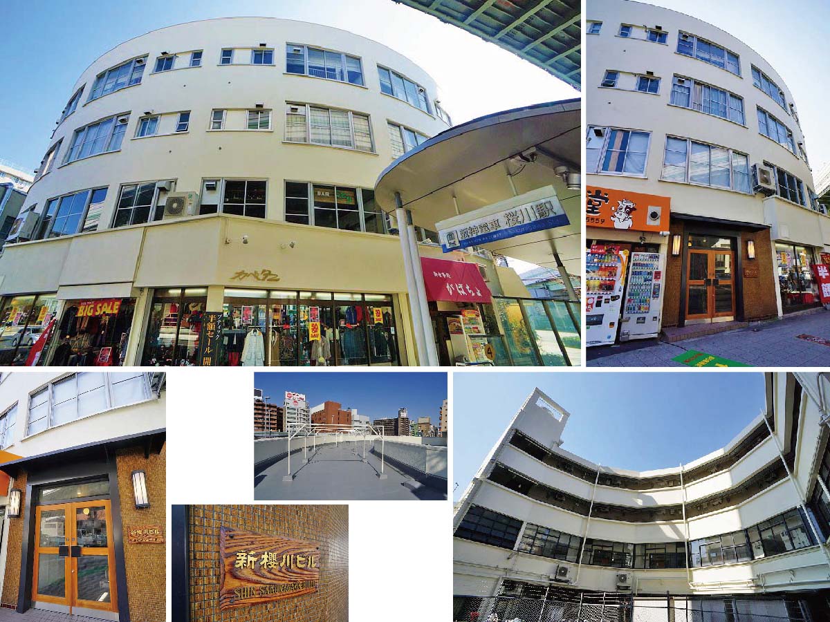 戦後の高度経済成長期には、新しい都市住宅の在り方として、下層階に店舗や事務所・上層階に賃貸住宅を設けた『併存住宅』が注目を集めるようになったが、この『新桜川ビル』も当時の大阪府住宅協会(現:大阪府住宅供給公社)が併存住宅として設計したもので、滑らかな曲線を描く扇形の外観フォルムや、格子の窓枠をリズミカルに配置した意匠性から、当時の設計技術の粋を極めた建物であったことが窺える。