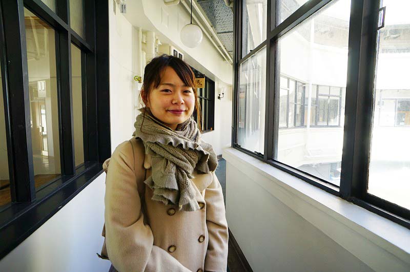 ▲『新桜川ビル』を案内してくれたアートアンドクラフトの土中萌さん。1・2階は店舗と事務所、3・4階は賃貸住宅フロア、屋上には入居者専用の洗濯物干し場がある。「阪神高速をすぐ目の前に眺める屋上スペースは最高です」と土中さん「この『新桜川ビル』は、住宅が足りない時代に“賃貸住宅をもっと街なかに増やそう”という計画で建てられたと聞いています。