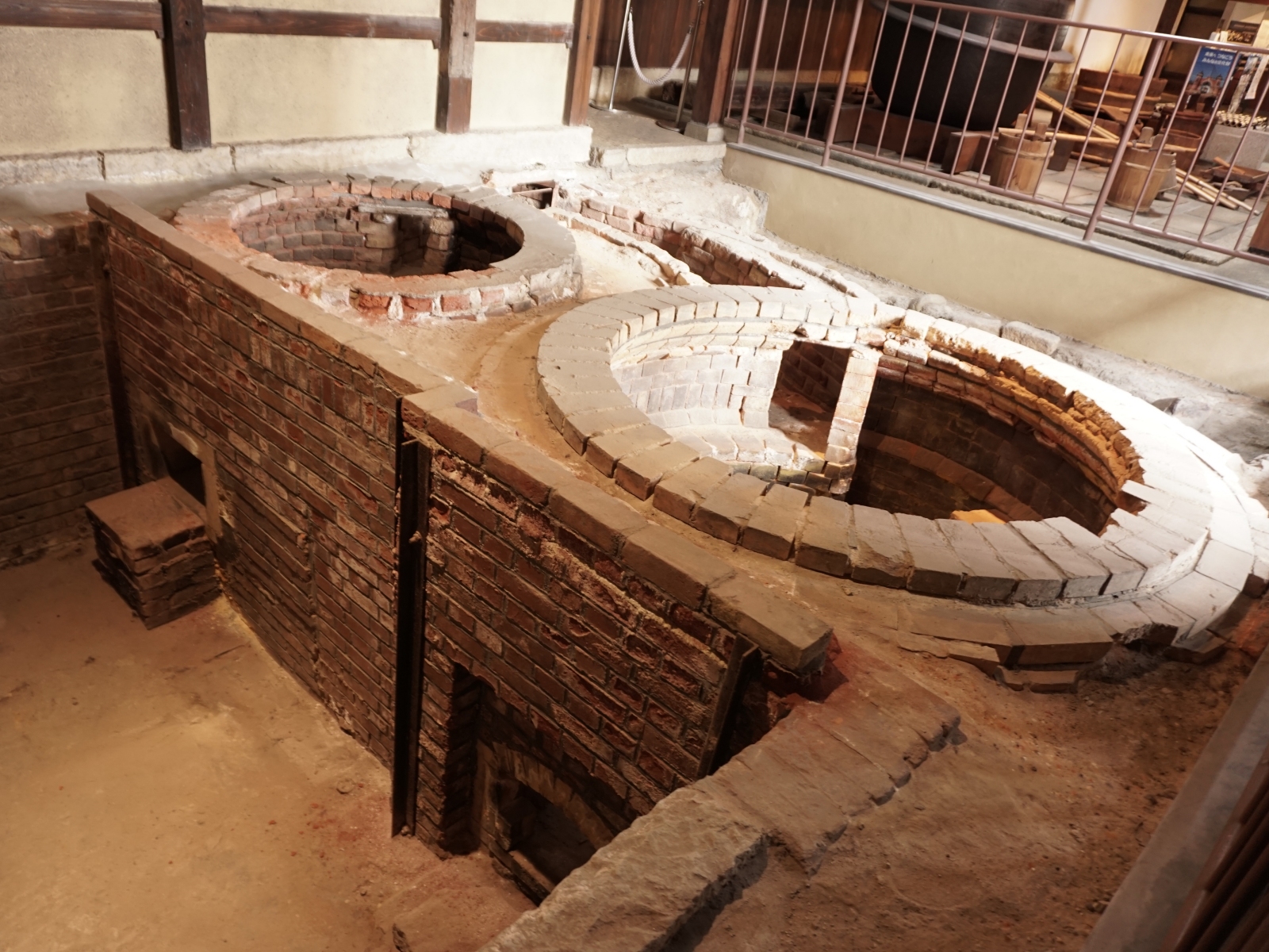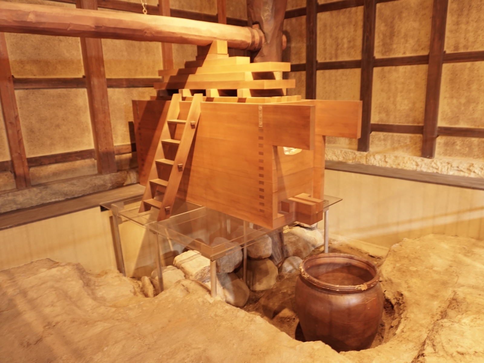 酒造りの場は時代により変遷があり、現在見学できる釜屋は幕末以降のもの。大きいかまどと小さいかまどが掘られており、さらに下部に焚き口がある。かまどといえば土間から盛り上がっているものを連想するが、酒造りのかまどは地下。かまどの上に湯を沸騰させて蒸気を出すための鉄の羽釜を、さらにその上に米を蒸す甑を乗せねばならないため、掘られたかまどでないと安定が悪いのだ。