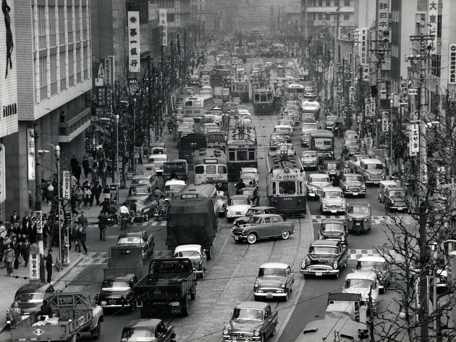 戦後はいち早く復興し、「戦後復興はまず市電から」とも言われたが、昭和30年代に自家用車ブームが起きると、市電は衰退。ついには「市電は交通渋滞の元凶」と報道されるようにさえなる。市電の線路と車道は区画されてはいたが、道幅が広くないことに加えて、輸送手段も船からトラックへと変化するなど、急激に車が増えたため、実際に市電の停車が交通を滞らせることも少なくなかった。昭和35年には、市内の道路交通が10時間も⿇痺することもあったそうだ。