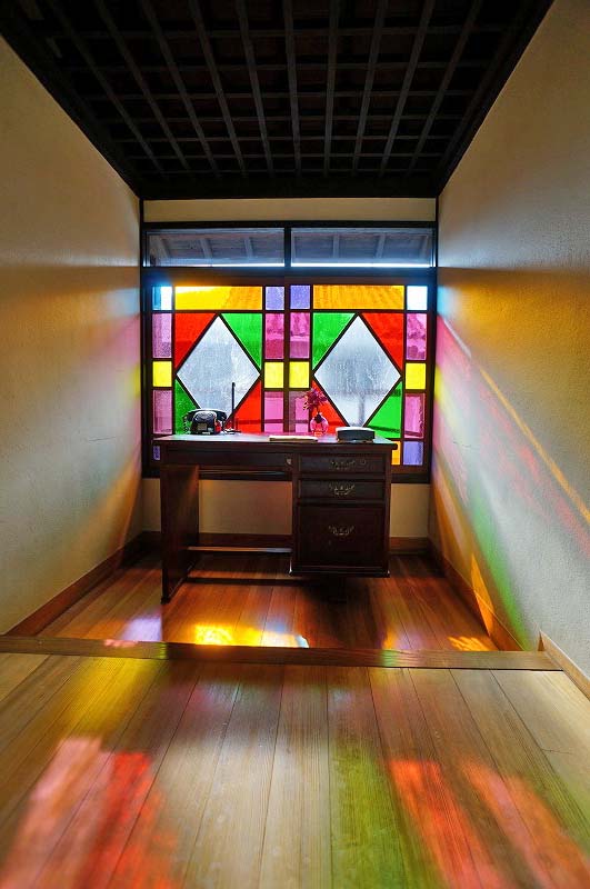 ▲2階廊下にあるレトロなステンドグラスは、もともとこの建物にあったものではなく、宮崎監督のデザイン画を元にして昔ながらの手延べガラスで再現されたもの。「監督の意見も取り入れているので、時代考証からいくと多少ズレる部分もあるんですが、本物の技術で本物を再現すれば、ちょっとした時代の違いがあっても、その建物は生き還ると思います。安普請でカタチだけ直すというのはいちばんダメ。その時代、その時代のちゃんとしたものを作れば、今後も建物は残されていくと私は考えています」と松居さん実は、この『御舟宿いろは(旧魚屋萬蔵宅)』の再生にあたり、無くてはならない存在だったのがアニメ界の巨匠・宮崎駿監督だ。