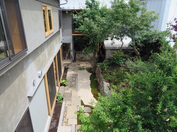 さらにガラスの部屋の脇から敷地奥に伸びる細い通路を進むと、そこは庭になっており、なんと、今どき珍しい築山(観賞用として人工的に作った山)があり、手水鉢も置かれている。地価の高いこの辺りとしては非常に贅沢な作りである。