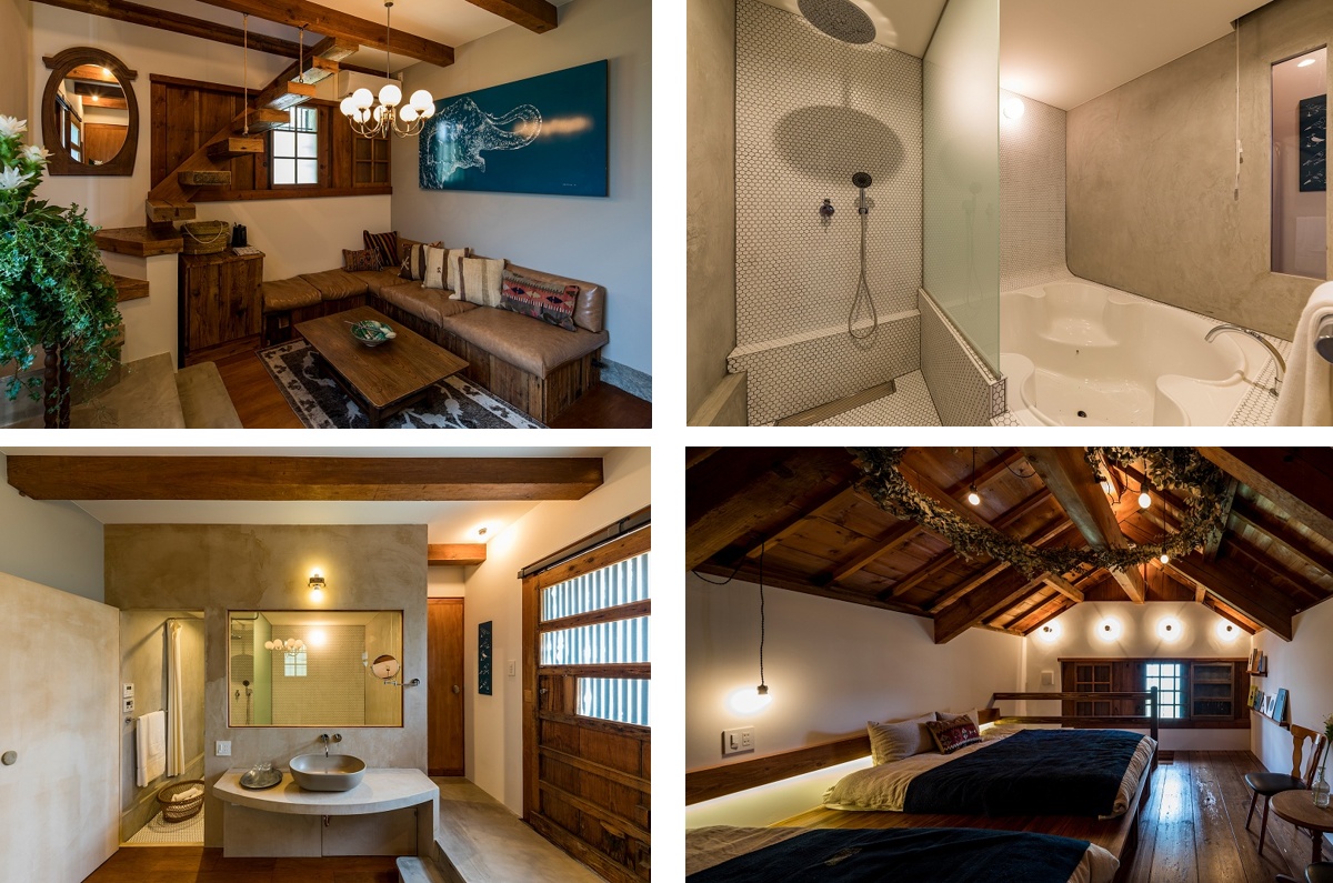 「⽇常にあったはずの⼩さな”⾮⽇常” を取り戻す場所」をコンセプトに、ジェットバスのあるバスリビングと屋根裏のような落ち着いたベッドルームが、その古い⼟蔵の中にある。⼥性を中⼼ターゲットとした1⽇1組限定の特別な空間で、最⼤4名まで宿泊可能だ。場所は、元町エリアと呼ばれる葉⼭の中⼼地だ。