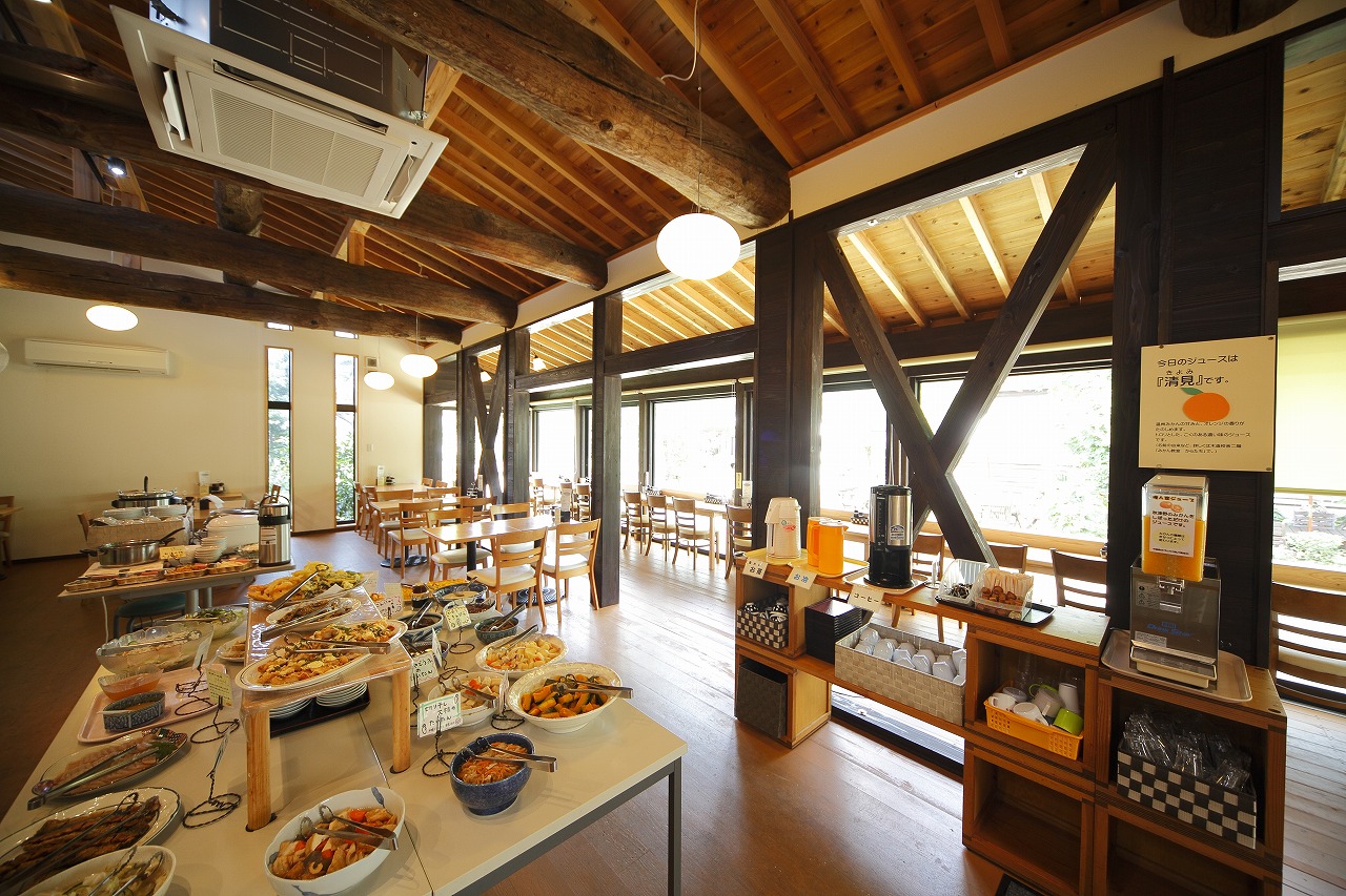 敷地内には、2階建ての旧⽊造校舎がある。⻑い廊下を進むと、かつての教室があり、そこには昔ながらの机が並ぶ。各教室は、お菓⼦づくり体験⼯房や交流スペース、地域のみかん作りの歴史を紐解いたみかん資料室等に活⽤されている。⼀⽅、宿泊棟とレストランを2008年のオープン時に新築し、地元のお⺟さん⽅がつくるスローフードバイキング料理を提供する農家レストラン、そして全7室の「『農』のある宿舎」という宿が誕⽣している。