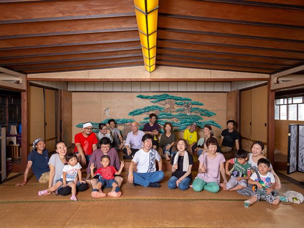 「寿ゞ家」本館2階、30畳の大広間。舞台上の背景は、扉の表に富士山が描かれ、扉を開けたその奥に松と鷹が描かれている。上の写真中央の白いシャツを着ているのが天野さん(写真提供:天野さん)。「最初はこの広間にも埃が数センチ積もっていて、土足で歩いていました。掃除をして畳を水拭きして人がまた出入りするようになると不思議なもので畳も建物自体もシャンとしてくるんです」。今回のプロジェクトで改めて木造建築の再生力の強さを感じたという