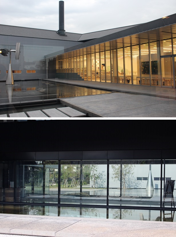 <写真上>中庭の水盤。あいにく取材時の撮影が夕方遅くになってしまったが、天気のいい昼間は水面がきらきらと美しい。地域に開かれた使い方もされ、半田市で春と秋に行われるまつりでは、水盤の水を抜いて山車がこの中庭にひきこまれる<写真下>入口の右側にも水辺があり、中庭の水盤と一面ガラスの廊下を挟んで空間のつながりを出している井戸水は、MIZKAN MUSEUMの南側にある中間実験棟の屋根に設置された太陽熱温水パネルと共に空調に利用されている。温水と夏冷たく冬温かい井戸水を適宜使い、空調負荷を軽減する。