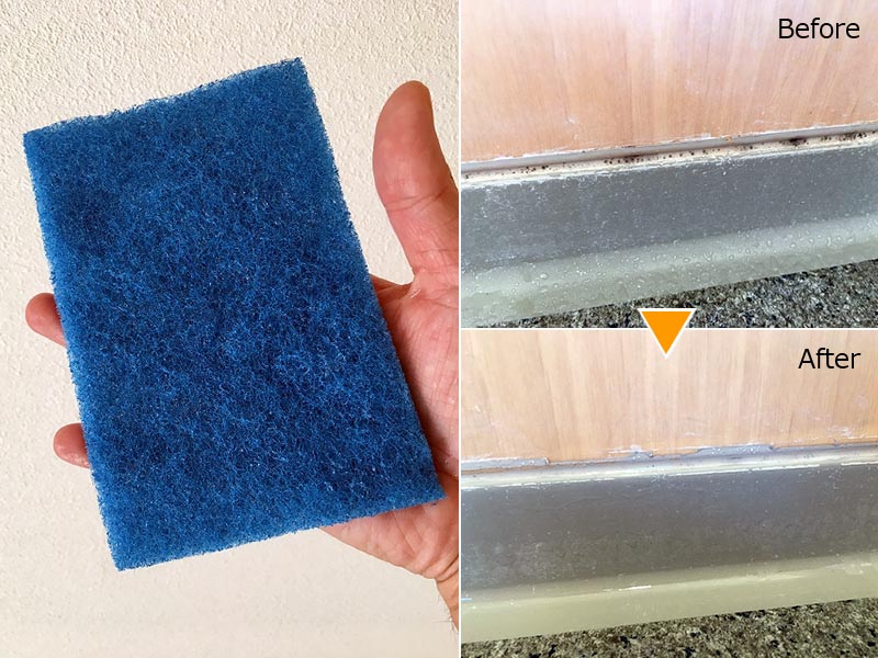 一方、100円ショップで買えるカビ取りスポンジは、そのようなデメリットがほとんどなかった。塩素系カビ取り剤で取れなかったシステムバスの目地(コーキング)のカビを擦ってみたところ、2~3往復した時点でかなり除去できた。同時に白く固まった水垢汚れが取れるのもうれしい。ただし、紙やすりのように削って汚れを取る方法なので、掃除をする場所や力加減には注意が必要だ。