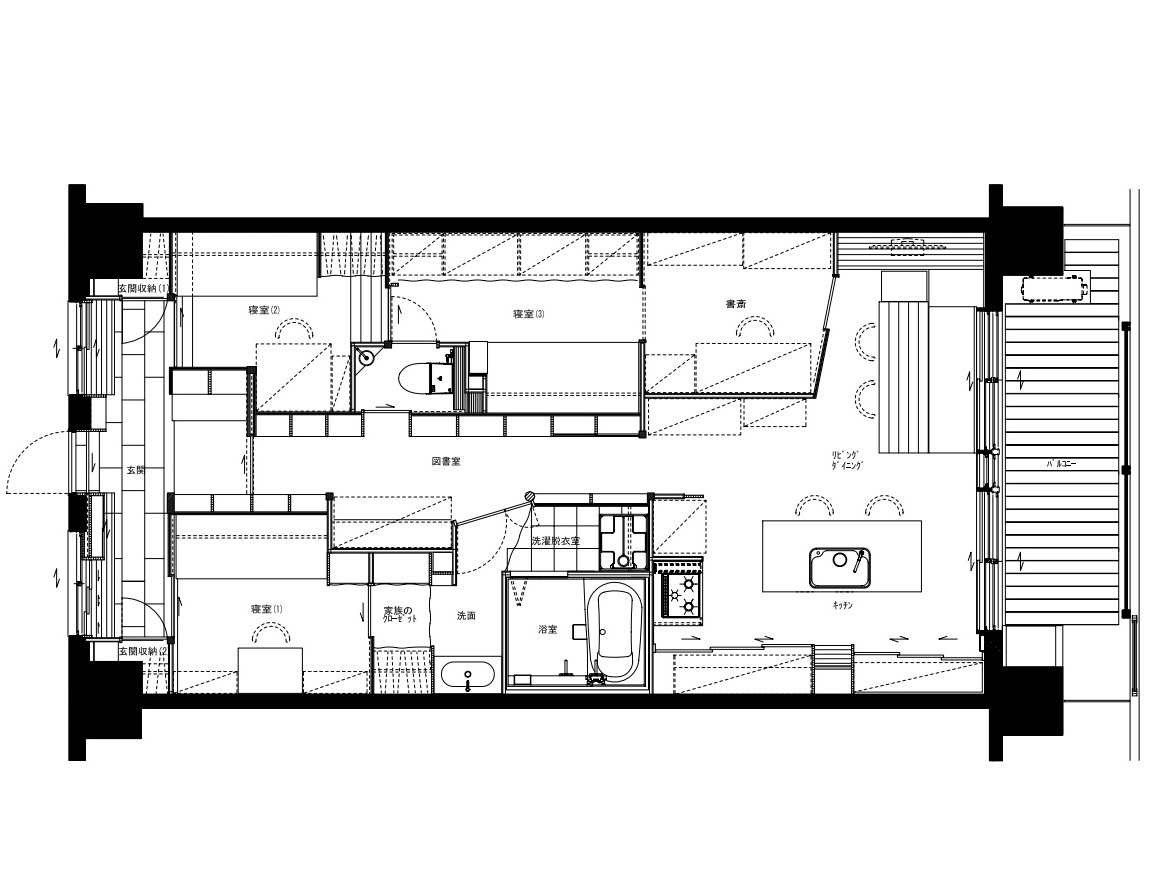 この空間は、母親と中学生、小学生の子どもが暮らす、3LDKの普通のマンションだった。マンション特有の風通しの悪さや、収納スペースの確保に不満を覚えつつ、なんとかやりくりしながら家族3人で暮らしていたそうだ。だがリフォーム後は、家の中央を通る廊下の両側に、家族3人それぞれの個室を配し、奥にDKを設けた間取りに。マンションでありながら、間取りを大幅に変更したのだ。また、80m2に満たない広さだが、収納空間をたくみに確保しながら、集合住宅特有の風通しの悪さを解消。さらには住戸の温熱環境の向上を目指した工夫がなされている。