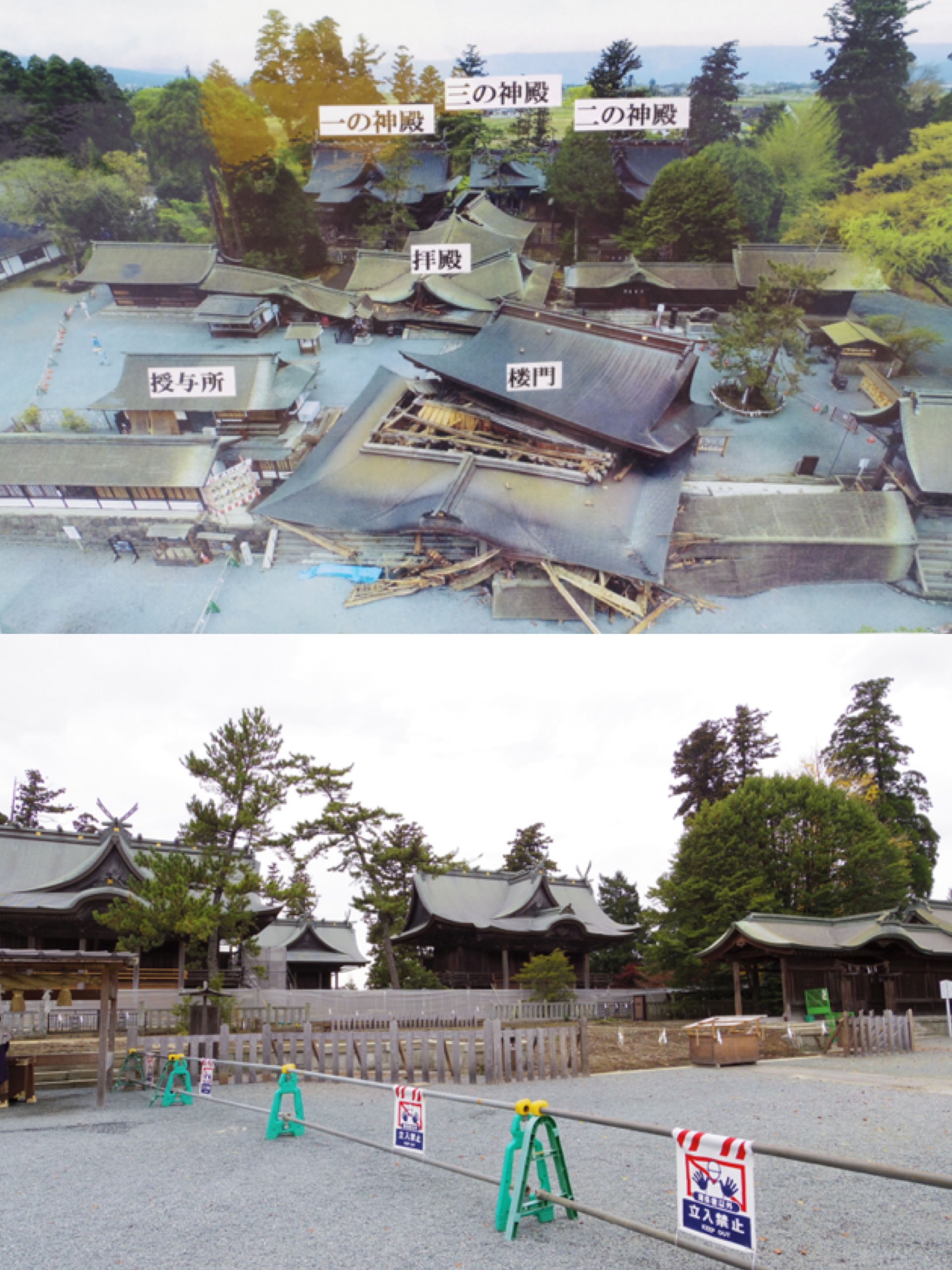 阿蘇神社の楼門と拝殿は全壊し、国道も分断された。橋が崩落し、一時陸の孤島となってしまった地域もある。幸い商店街周辺で人的被害はなかったが、建物の全壊が2軒、大規模半壊が4軒、一部損壊も多数とそれなりに被害を受けた。