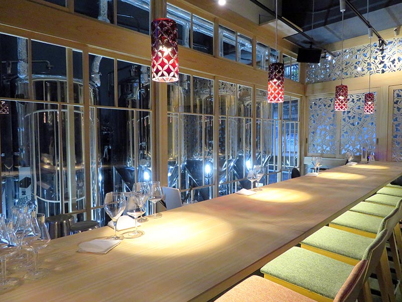 建物はかつてガラス倉庫だったビルの1階。天井高が3.6mほどもあり、扉を開いて入ると想像以上のスケールに驚かされる。店内は右3分の1ほどがガラスで仕切られた醸造スペースとなっており、スチールのタンクが並ぶ。照明の光を受けて輝くタンクは川崎のコンビナートの夜景のようでもあり、見た瞬間、工場萌えという言葉が浮かんだ。