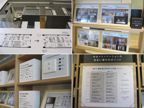 その他、映像や実物展示に触れながら、リノベーションの進め方やノウハウを知ることができるコーナーも。マンションと戸建てのできることとできないこと、中古物件のメリットなど、知っておきたいポイントがコンパクトにまとまっている。図書館のような落ち着いたスペースでゆっくりと情報収集ができる。