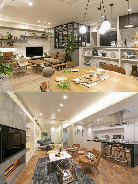 「リノベーションで得られる暮らしに憧れを感じるエリア」には、一般的な75m2のマンション空間をリアルサイズで再現。ふたつのパターンをみることができる。