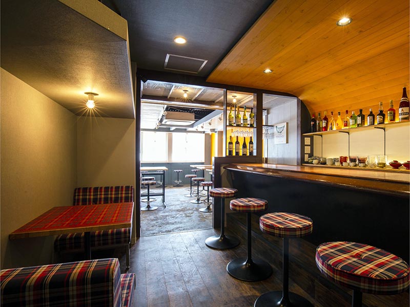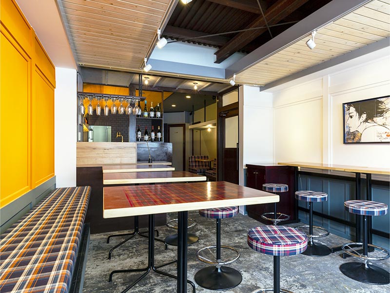 改築は工務店に任せたが、もともとあった物件の「二面性」は残したいと考えた。店に入ると、右側はバー空間になっていて、床が高いため天井が低く感じる。これに対して左側のスペースは、大きな窓があって開放的、明るい雰囲気があった。そこで、バー空間の天井をさらに低くしてアールをつけ、穴蔵感を出した。「狭いので肩を寄せ合わねばならず、巣ごもり感が出ます」と、細川さん。逆に左側のスペースは天井の色を明るく、テーブル同士の間隔を広くして、広々と感じられるようにした。