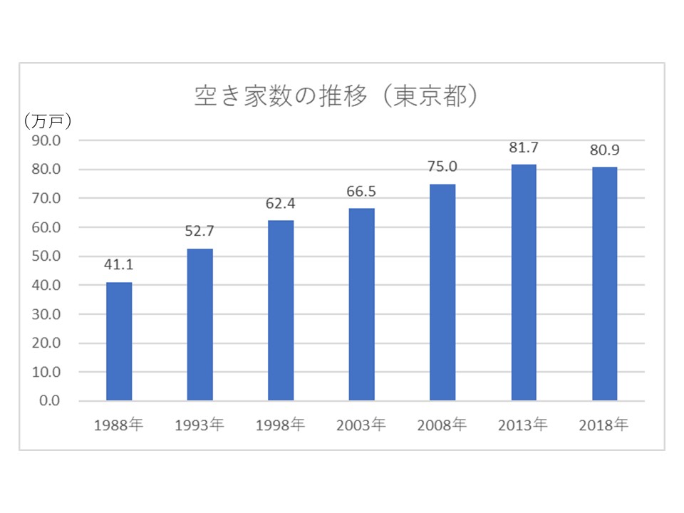 東京都でも空き家は大きな問題となっている。都の2018年の空き家率は10.6%と全国平均から見ると低い。しかし、空き家数は80万9,000戸と他の道府県に比べて圧倒的に多く、2013年以降高止まりの状態が続いている。