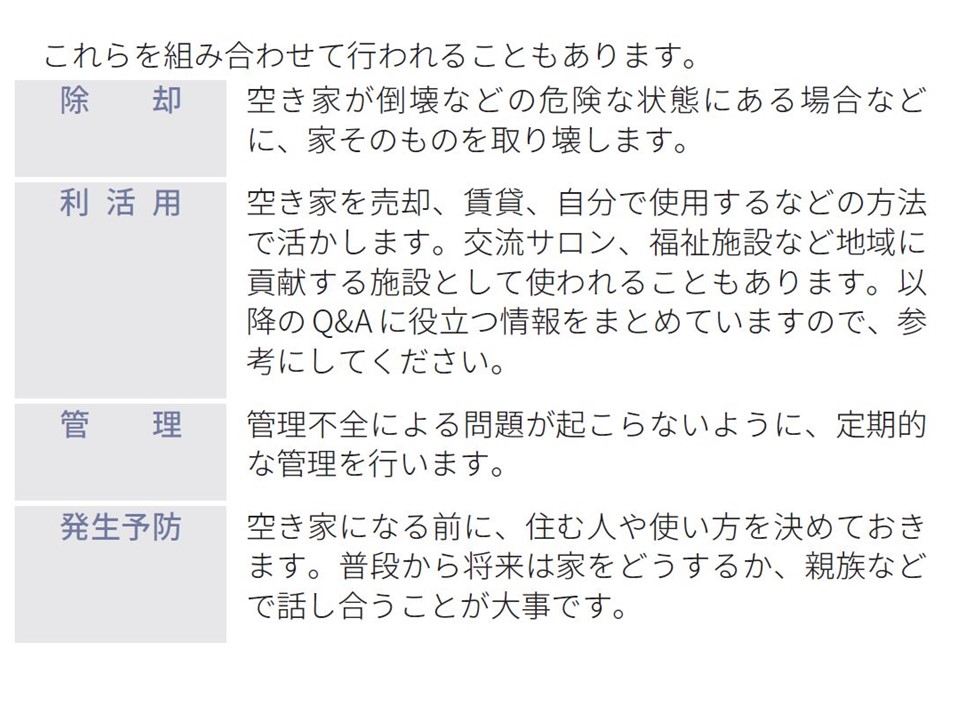 たとえば、「空き家の解決策にはどんなことがありますか?」に対しては、①家を取り壊す「除却」、②売却や賃貸などの「利活用」、③問題が起こらないように定期的に行う「管理」、④空き家になる前に使い方などを決めておく「発生予防」の4つの解決策が考えられる。また、空き家を売却したり、賃貸に出す方法など具体的な解決方法にも触れているので、このギモン編を読めば大体の問題の解決方法が見つかりそうだ。