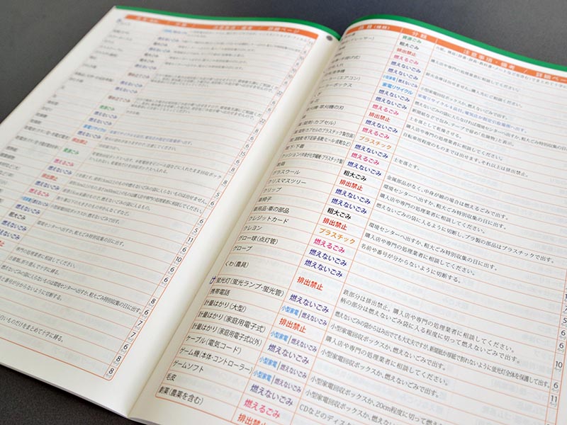 ゴミステーションでは、住民の協力のもと、細かなゴミの分別が行われている。その分別に役立っているのが、町から各家庭に配布される「家庭ごみ総合案内」という冊子だ。クレヨンは燃えるゴミ、クリスマスツリーは燃えないゴミ、紙製の米袋は資源ゴミ、といった具合にどんなものを何ゴミとして出せばいいか細かく紹介しているほか、ゴミの出し方、コンポスト容器での生ゴミたい肥の作り方なども記載されている。