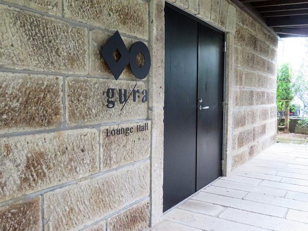 さて、最後に実際の現地を。通りに面したguraは周辺から見ても低層の建物がゆったり建てられており、とても贅沢。手前の広場には石蔵に使われているのと同じ中川石が使われ、その奥、右手には緑の芝生。建物は左手にあり、開口部の大きなレストランがまず目に入る。レストラン、庭はウエディングにも使われているそうで、気持ちのよい野外パーティーの様子が目に浮かぶ。