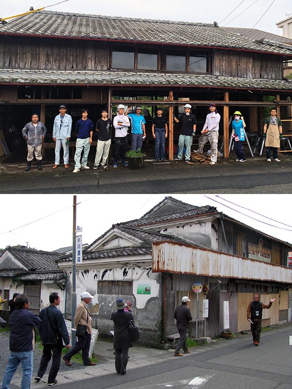 石垣チームの様子を見ていたおこそ会古参の副理事長・石元宏二さん(現:理事長)は、原田書店の向かいにある空き家を借りてきて、再チャレンジを提案した。やはり家主は遠方に住んでおり、家財道具もそのままに、30年近く放置されていた家だという。これまた築100年を超える商家だ。