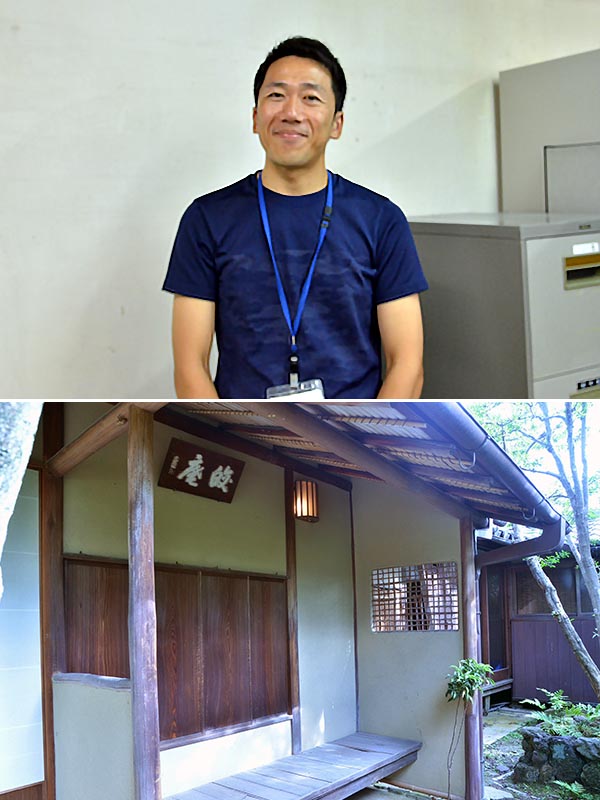 上/長岡京市 総合政策部 公共施設再編推進室 財産管理活用担当 室長補佐・近藤昇さん。「『暮らしランプ』の活動を通して中野家住宅に愛着を持ってもらい、みんなで保存していこうという機運が高まれば」 下/1951年に建てられた、敷地の東側にある茶室「皎庵(こうあん)」最初に建てられた主屋は、間口の広い敷地に近郊農家(大都市周辺にある農家)の特徴を備えるとともに、格子の表構えや間取りに町屋としての特色も見られる。ただ、「当時、中野家がどういった商売をしていたかは定かではありません」と、長岡京市 総合政策部の近藤昇さん。「大きな庄屋であり、お酒を扱っていた商家だったのではと考えられています。そのため、かつては中野家住宅も多くの人の出入りがあったのではないでしょうか」